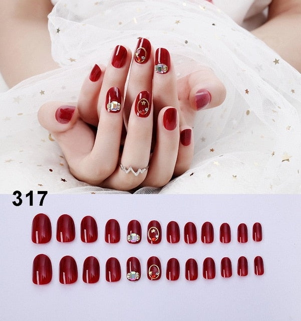 24Pcs Fake Fingernails Full Cover Short Round Press on Nails Dripping Shape Heart Pendant Nail Tips Wearable Fake Nail with Glue