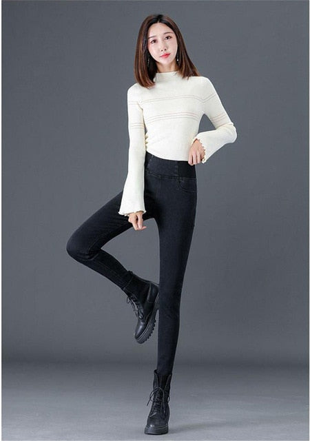 Woman Blue Denim Pencil Pants: Stretch Waist Women Jeans